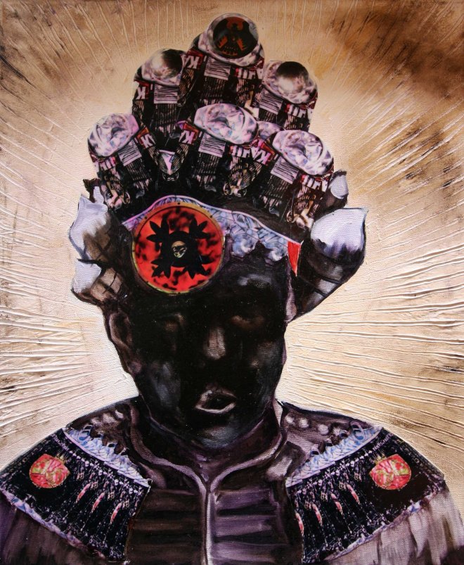 Old alone and the dole, riddle on top of a trash bowl, oil and digital print on canvas, 46 x 37,5 cm. 2015