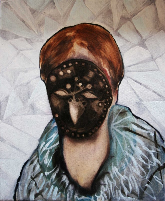 Whistling life into a sparrow pipe, oil, resin and digital print on canvas, 46 x 37,5 cm. 2015