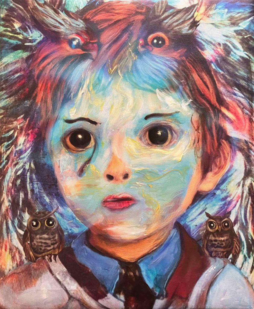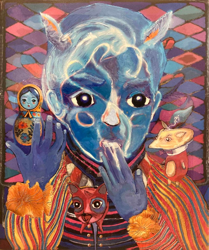 The mind of the world in multicolours, oil and ink on polyester, 46 x 38 cm. 2024