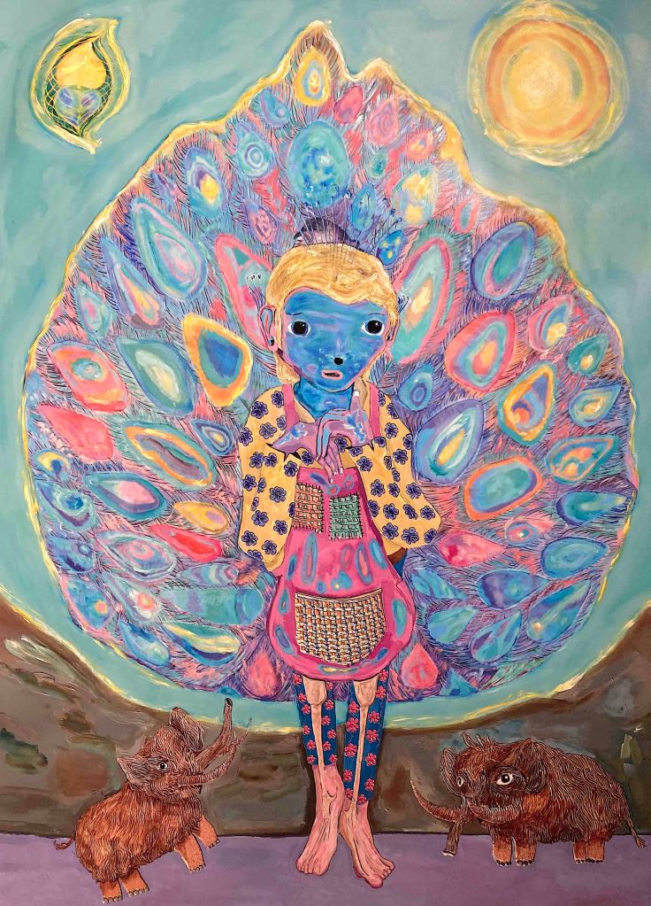 Peacock called Elaine, oil, acrylic and ink on PVC, 140 x 101 cm. 2024